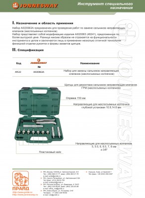 Инструменты и приспособления специального назначения производства компании JONNESWAY® ENTERPRISE CO., LTD., по уровню исполнения относятся к изделиям класса PROFESSIONAL, применяется для производства работ по сборке, ремонту и обслуживания продукции машиностроения, строго персоналом, имеющим соответствующую квалификацию, знакомым с правилами техники безопасности, условиями эксплуатации и навыками работы со специальным инструментом и приспособлениями.