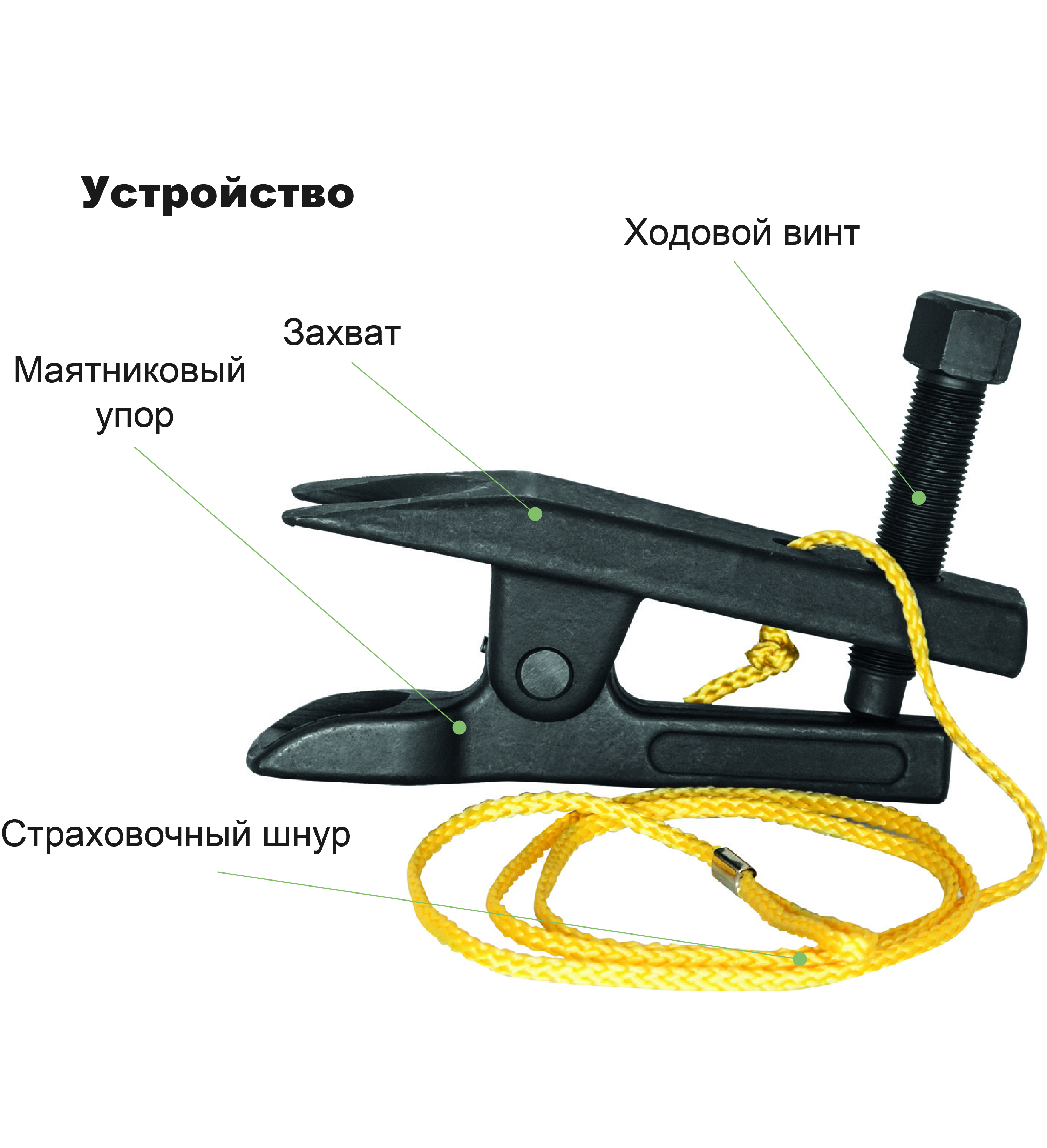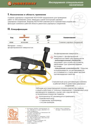 Съемник шарнирных соединений рычажный. Диаметр шейки демонтируемого пальца шарнира 18 мм. Страховочный шнур, входящий в комплект изделия, закрепленный на неподвижных элементах подвески или кузова автомобиля, предотвращает падение съемника при разъединении деталей узла. Для защиты от агрессивных воздействий на детали съемника используется фосфатирование.