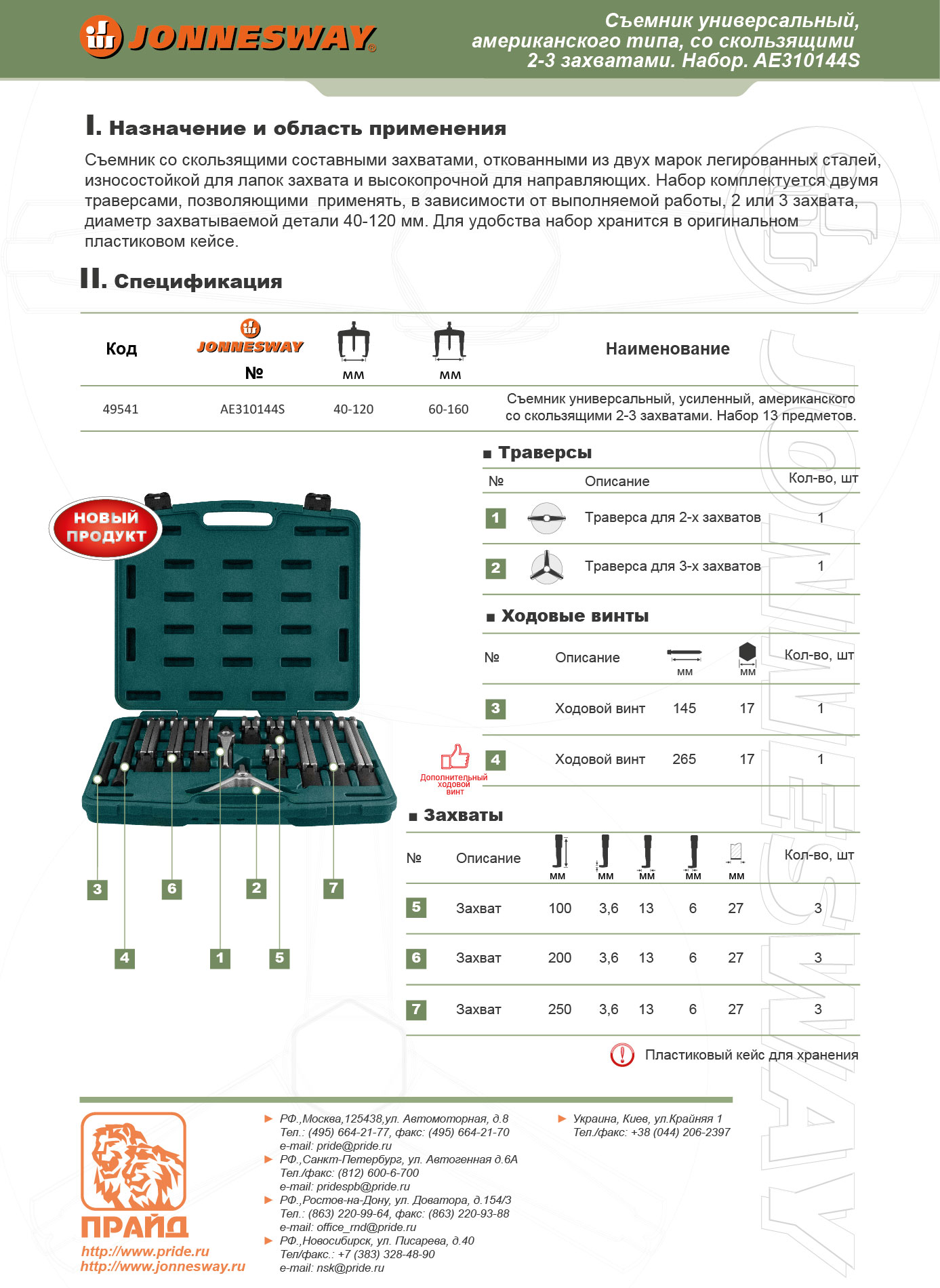 Съемник универсальный, американского типа со скользящими 2-3 захватами в наборе, диапазон захватов внутр./наружн. 60-160/40-120, глубина 100-250 мм. Для удобства детали набора хранятся в оригинальном пластиковом кейсе.