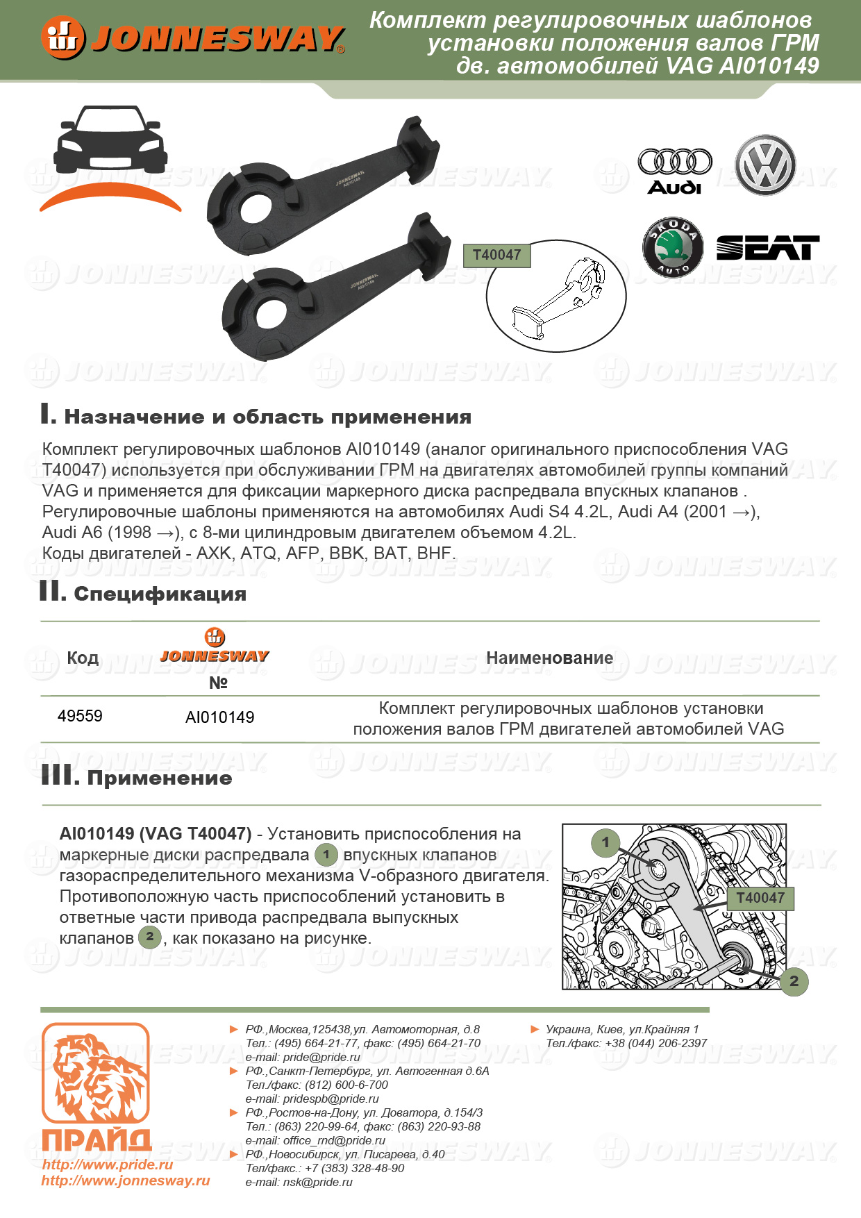 Комплект регулировочных шаблонов используется при производстве работ по замене ремня ГРМ на двигателях автомобилей группы VAG для фиксации маркерного диска распредвала впускных клапанов. Изделие применяется для обслуживания двигателей автомобилей Audi S4 4.2L, Audi A4 (после 2001 г) Audi A6 (после 1998 г) с 8-ми цилиндровым двигателем объемом 4.2L.