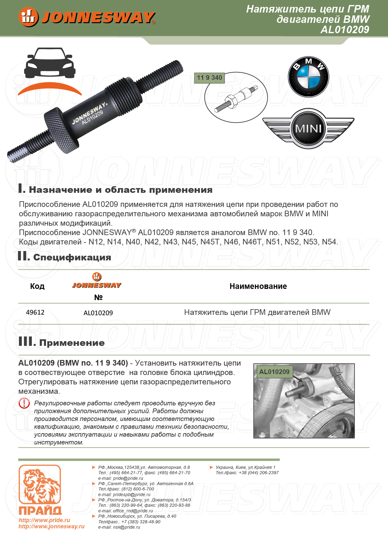 AL010209 Натяжитель цепи ГРМ двигателей BMW. BMW 119 340, код товара: 49612, артикул: AL010209