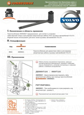 Приспособление предназначено для снятия и установки гайки верхней опоры и регулировки амортизатора кабины HGV грузовых автомобилей Volvo. Изделие можно использовать для всех типов грузовых автомобилей Volvo.