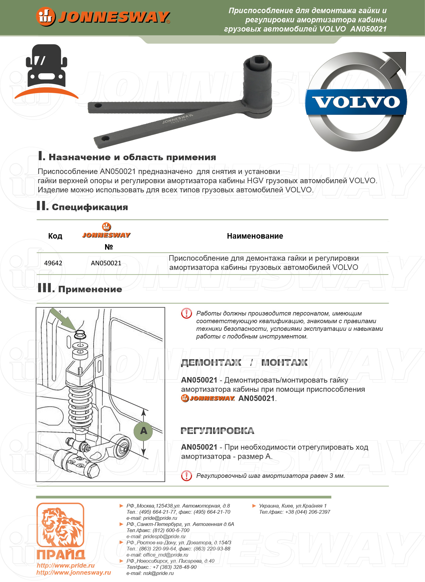 Инструменты и приспособления специального назначения производства компании JONNESWAY® ENTERPRISE CO., LTD., по уровню исполнения относятся к изделиям класса PROFESSIONAL, применяется для производства работ по сборке, ремонту и обслуживания продукции машиностроения, строго персоналом, имеющим соответствующую квалификацию, знакомым с правилами техники безопасности, условиями эксплуатации и навыками работы со специальным инструментом и приспособлениями.