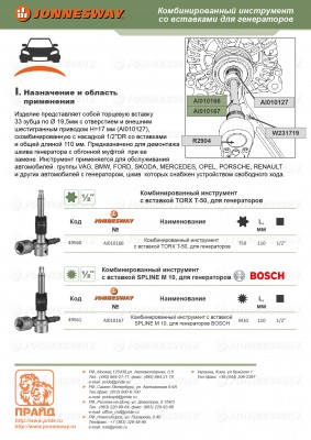 Инструмент применяется для обслуживания автомобилей группы VAG, BMW, FORD, SKODA, MERCEDES, OPEL, PORSCHE, RENAULT и других автомобилей с генератором, шкив которых снабжен устройством свободного хода.