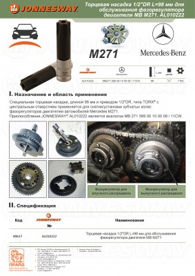 Применяется для снятия/установки зубчатых колес фазорегуляторов двигателей автомобилей Mercedes M271. Приспособление Jonnesway AL010222 является аналогом MB 271 589 00 10 00 09 / 11CW.
