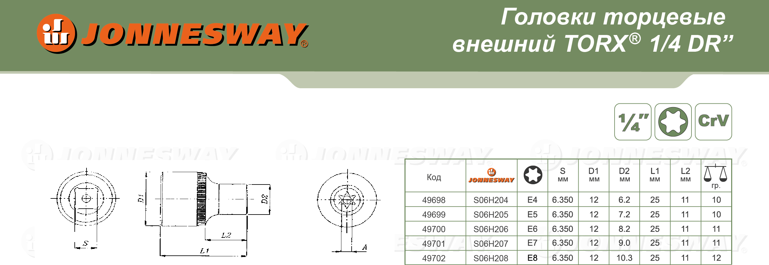 S06H208 Головка торцевая 1/4"DR, внешний TORX®, Е8, код товара: 49702, артикул: S06H208
