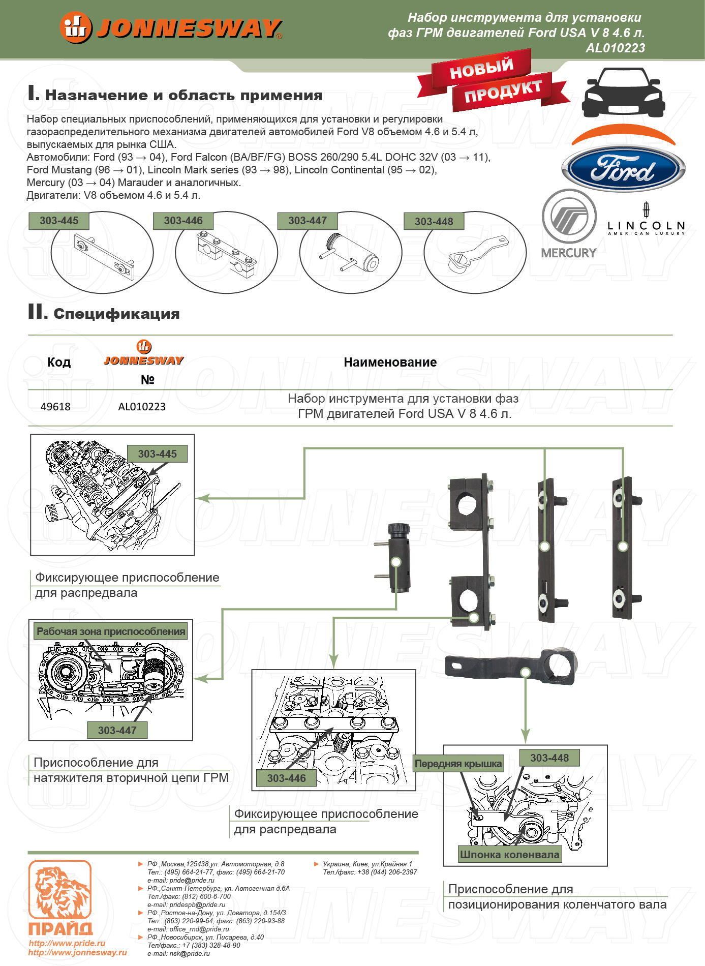 Набор специальных приспособлений, применяющихся для установки и регулировки газораспределительного механизма двигателей автомобилей Ford V8 объемом 4.6 л, выпускаемых для рынка США, таких как Lincoln Markseries, Lincoln Continental, Ford Mustang, Mercury Marauder и аналогичных.