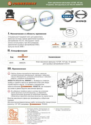 Специальный торцевой ключ для демонтажа фильтра системы смазки двигателей грузовых автомобилей Volvo. Инструмент также можно использовать при обслуживании двигателей грузовых автомобилей HINO, выпуска после 2006г.