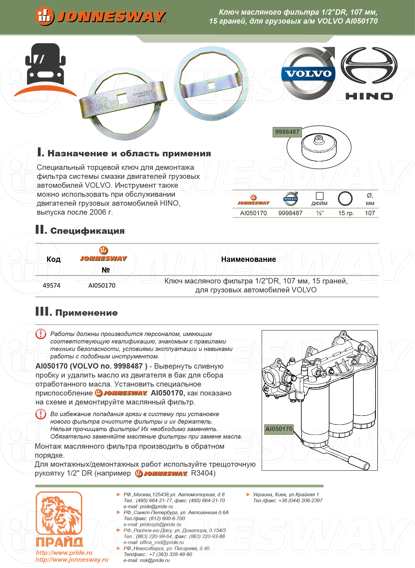 AI050170 Ключ масляного фильтра 1/2"DR, 107 мм, 15 граней, для грузовых автомобилей VOLVO, код товара: 49574, артикул: AI050170