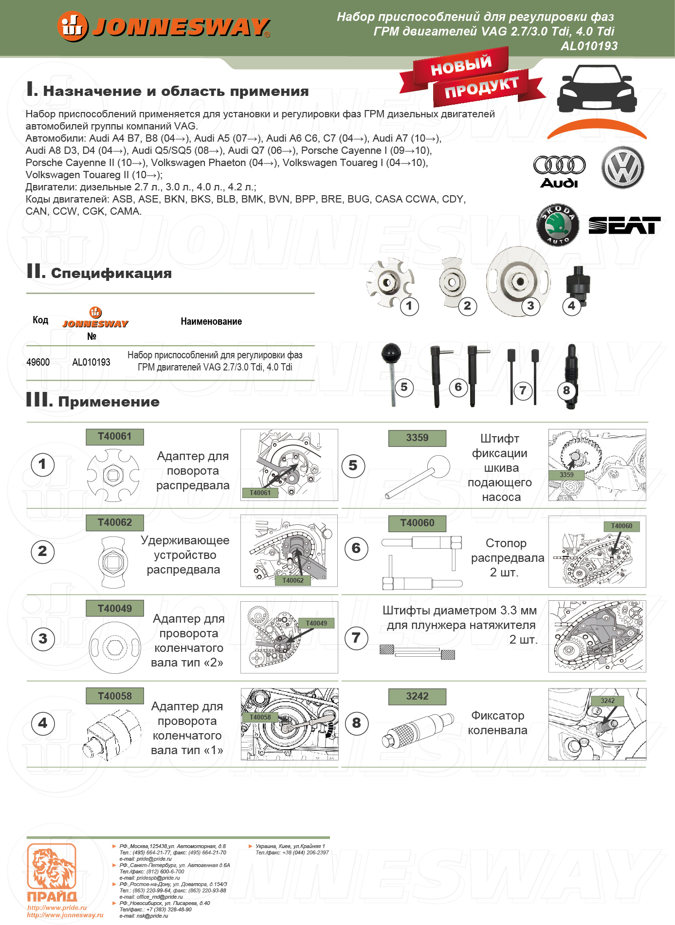 AL010193 Набор приспособлений для регулировки фаз ГРМ двигателей VAG 2.7/3.0 Tdi, 4.0 Tdi (ASE)Common Rail, код товара: 49600, артикул: AL010193