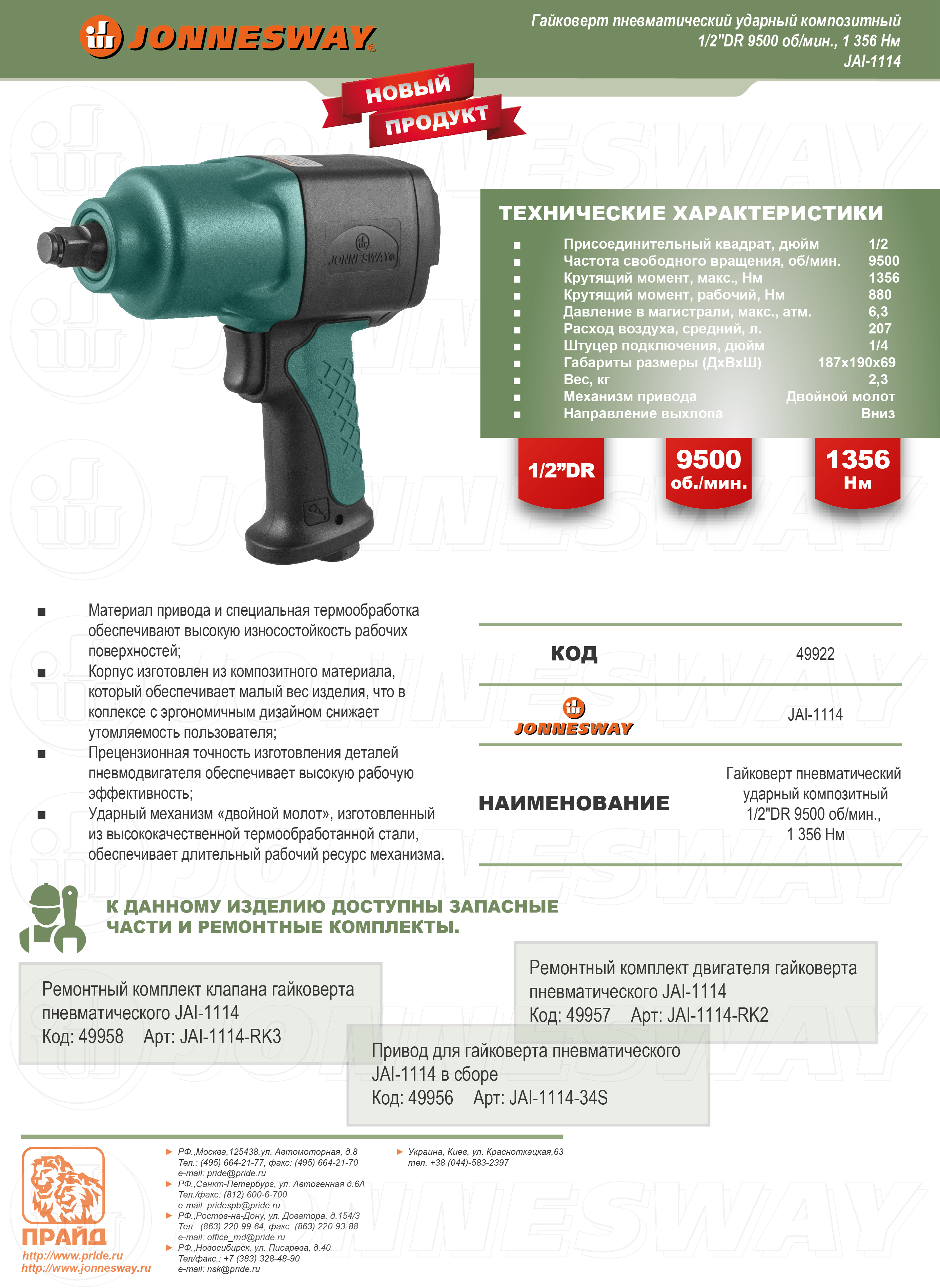 JAI-1114 Гайковерт пневматический ударный композитный 1/2"DR 9500 об/мин., 1356 Нм, код товара: 49922, артикул: JAI-1114