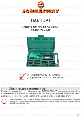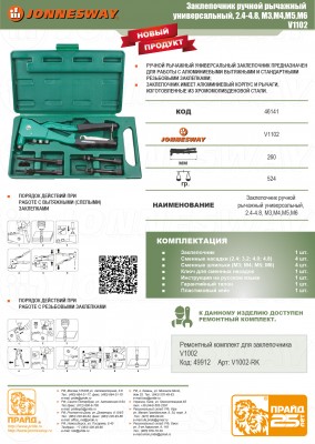 V1102 Заклепочник ручной рычажный универсальный для вытяжных и резьбовых заклепок, 2.4-4.8, М3,М4,М5,М6, код товара: 46141, артикул: V1102