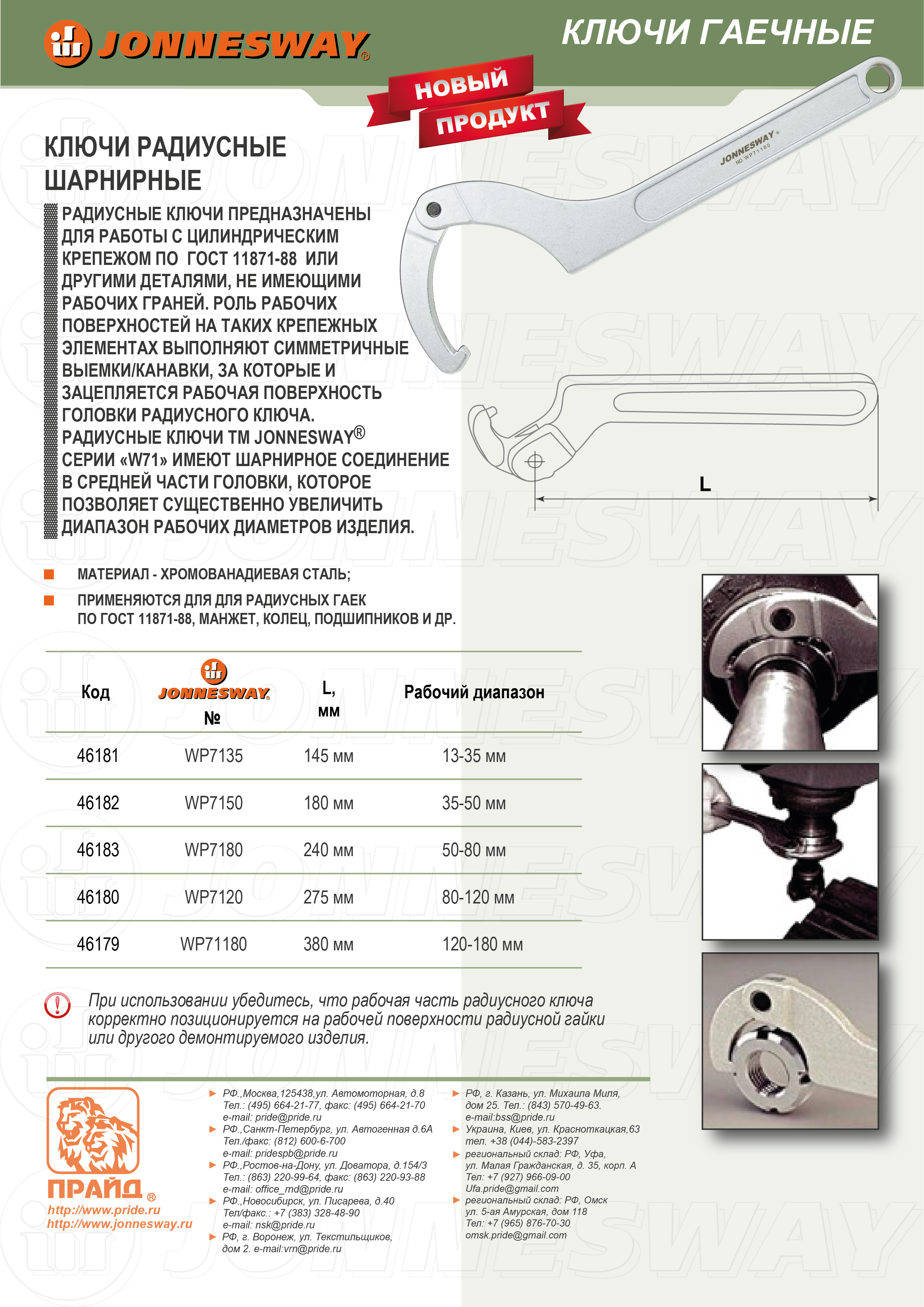 Радиусные ключи ТМ JONNESWAY серии «W71» имеют шарнирное соедиение в средней части головки, которое позволяет существенно увеличить диапазон рабочих диаметров изделия.