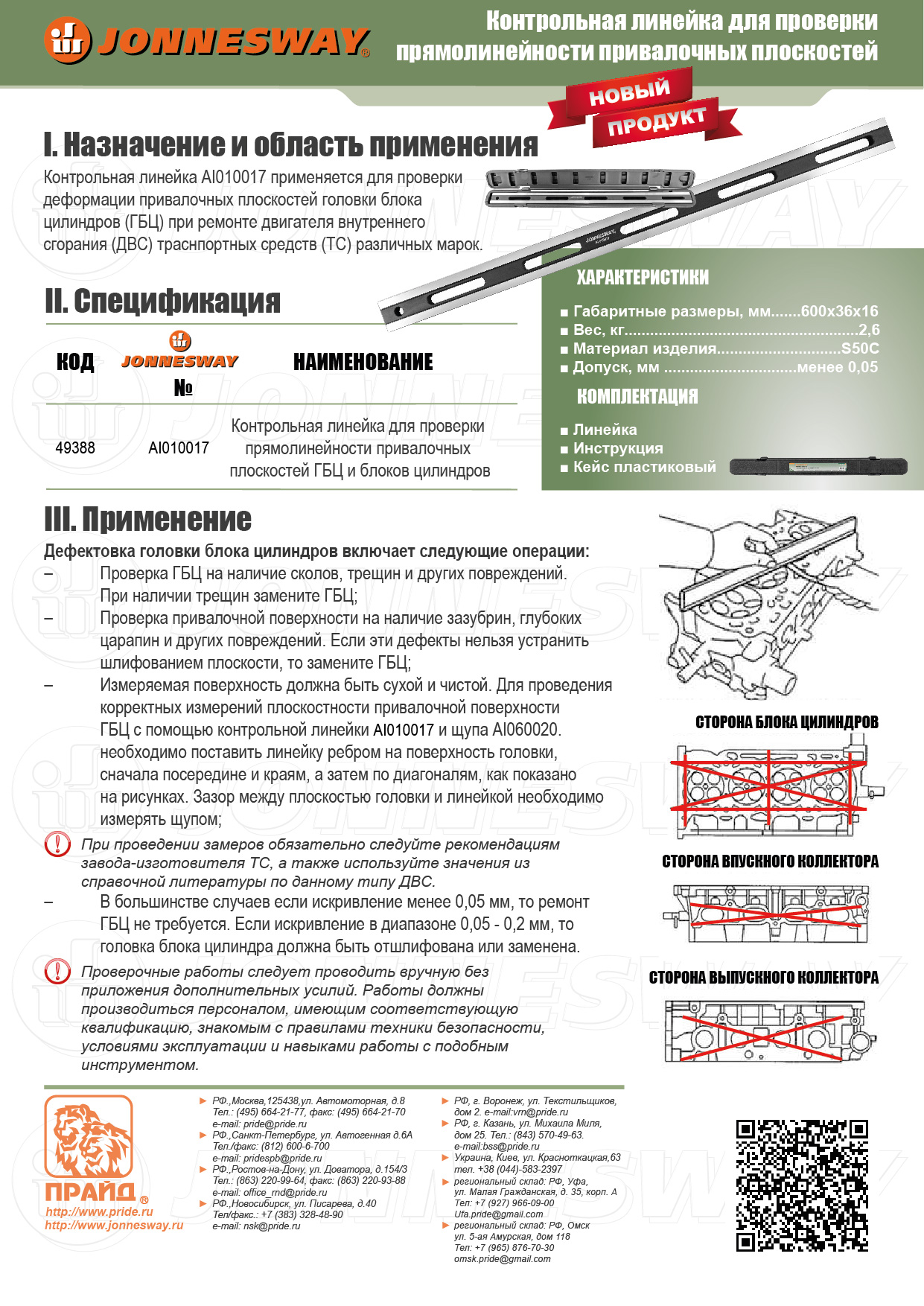 AI010017 Контрольная линейка для проверки прямолинейности привалочных плоскостей ГБЦ и блоков цилиндров, код товара: 49388, артикул: AI010017