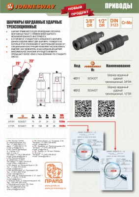 В отличии от стандартного карданного шарнира, данное изделие имеет два шарнира, у каждого из которых угол отклонения от центральной оси до 23°. Специальная конструкция позволяет использовать изделие, как удлинитель и как карданный шарнир. Максимальное значение крутящего момента превышает более чем в 2 раза величину по стандарту. Изготовлен из хромомолибденовой стали.